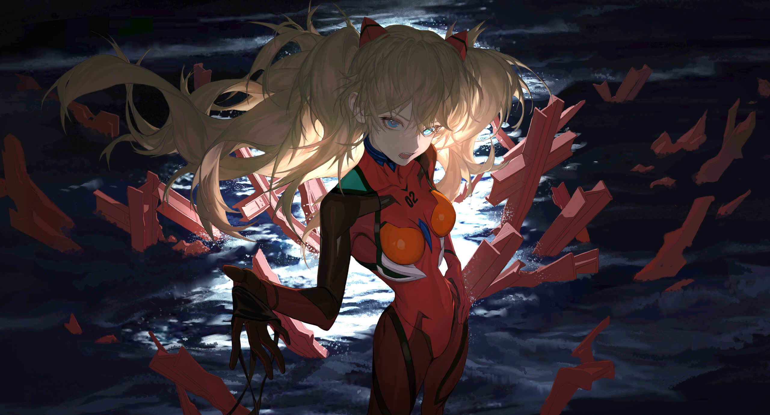 《新世纪福音战士》中的明日香,鲜艳长发与湛蓝眼眸形成强烈对比。身着红色紧身战斗服,胸前“02”字样醒目,金色长发在深色背景中飞扬。画面捕捉其战斗姿态,破碎的红色机甲部件环绕四周,整体色调以红黑为主。
