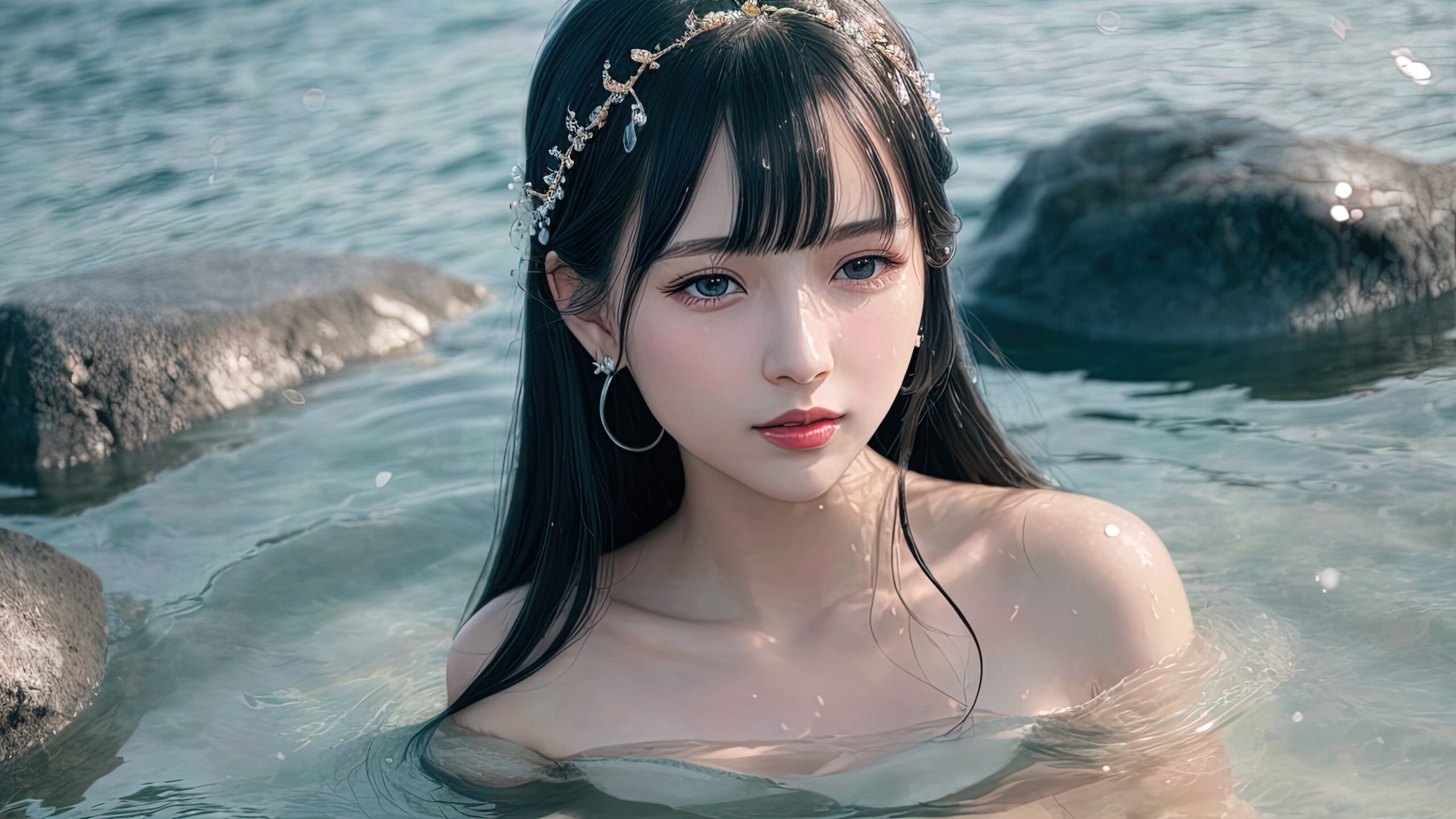 一位黑发少女半身浸于清澈水中,头戴缀有珍珠与金属花饰。她白皙的肌肤与乌黑长发在蓝调水光中形成鲜明对比,背景的深色礁石更突显主体。水面波纹折射出的柔光为画面蒙上梦幻滤镜,蓝白主色调营造出静谧而空灵的氛围。 更多