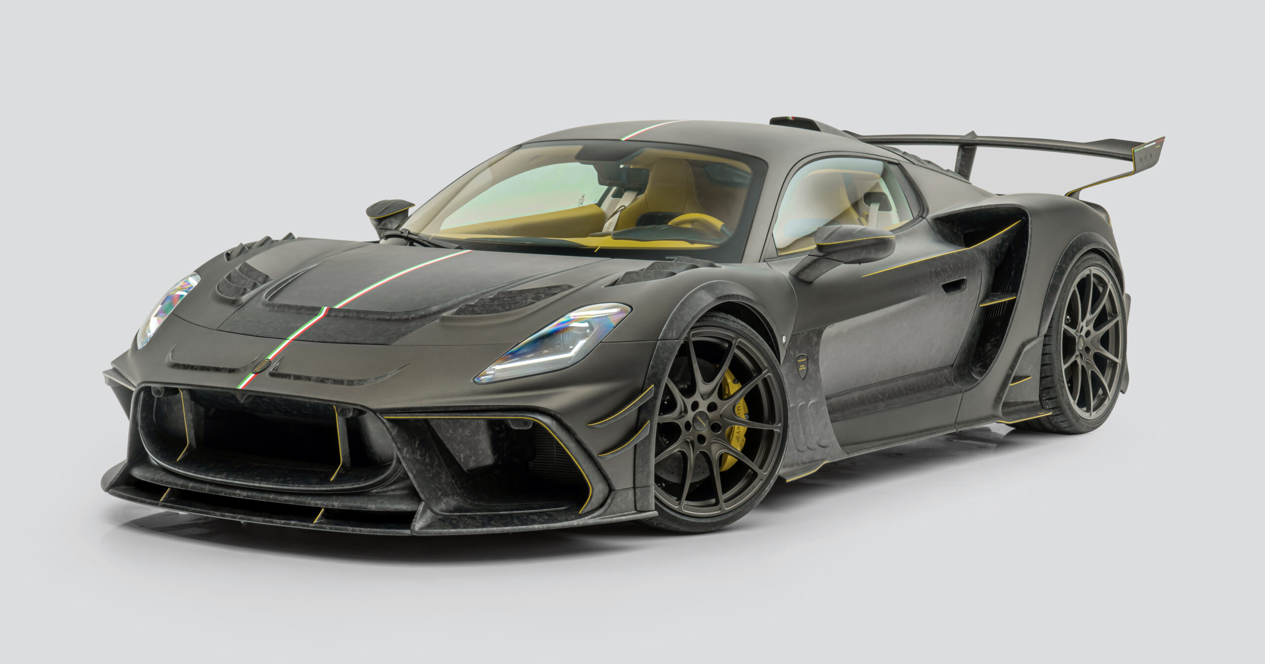 玛莎拉蒂MC20 Coupé经过改装,深灰色车身搭配亮黄色线条点缀,前脸夸张的进气口。车尾大型尾翼,黄色刹车卡钳。浅灰背景完美衬托车身流线造型,展现超跑美学。